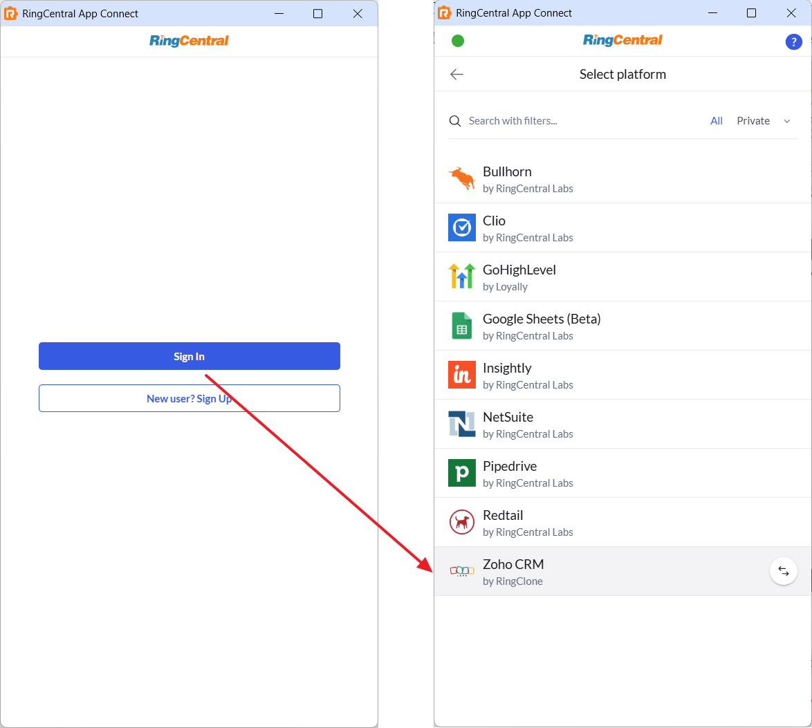 - Sign in to your RingCentral account in the extension, and select the Zoho platform.